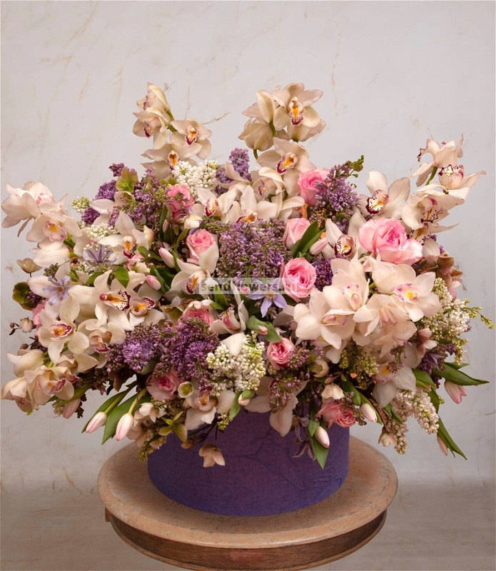 Состав: Оазис кирпич (15), Клематис (20), Хелеборус белый (20), Орхидея Цимбидиум белый (91), Сирень белая (20), Сирень сиреневая (20), Коробка шляпная большая (цилиндр) (1), Роза Pink Ohara (15), Тюльпан Dynasty (50)